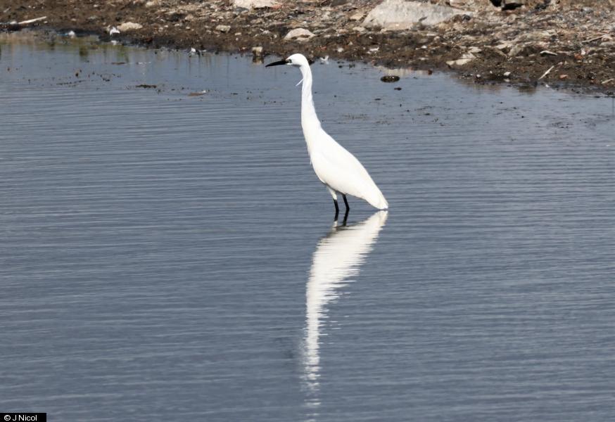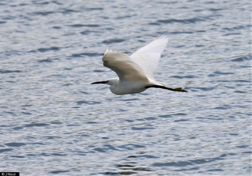 Sedge Warbler - 1 - calling from reeds on east side main lake. ; Little Egret - 1 - feeding around both lakes and island ; Little Egret - 1 - Second picture ; Redshank - 2 - noisy pair at the smaller lake.