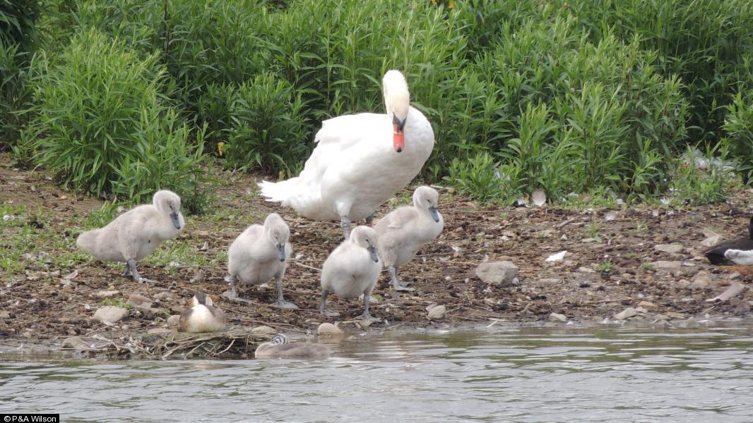 Song Thrush - 3 - Singing ; Great Spotted Woodpecker - 1 ; Whitethroat - 1 ; Long-tailed Tit - 2 ; Skylark - 7 - Singing ; Great Crested Grebe - 24 - 1 Juv ; Pochard - 23 ; Swallow - 1 ; Tufted Duck - 40+ ; Reed Bunting - 8 - Singing ; Black-headed Gull - 14 - 5 Juv ; House Martin - 6+ ; Sand Martin - 4 ; Greylag Goose - 7 ; Kestrel - 1 ; Lesser Black-backed Gull - 15 ; Redshank - 2 ; Lapwing - 3 ; Swift - 10+ ; Oystercatcher - 1 ; Pied Wagtail - 3 - 1 Juv ; Wigeon - 1 ; Little Grebe - 1 ; Willow Warbler - 1 ; Mallard - 18+ - 18 ducklings over 3 broods ; Canada Goose - 220+ - 15+ Juv ; Coot - 1+ - 1+ Juv ; Mute Swan - 10+ - 4 cygnets - juv Great Crested Grebe in foreground ; 324 - 1+ - Banded demoiselle ; 324 - 100+ - Common Blue Damselfly - mating