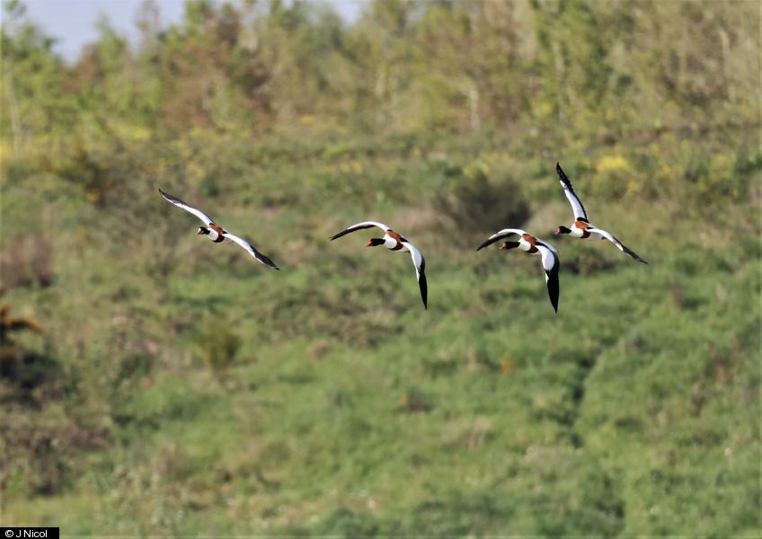 Shelduck - 4 - 3 drakes 1 duck. Circled main pond without landing. ; Lapwing - 1 - Female guarding single chick. ; Long-tailed Tit - 7 - Family group out feeding alongside river.