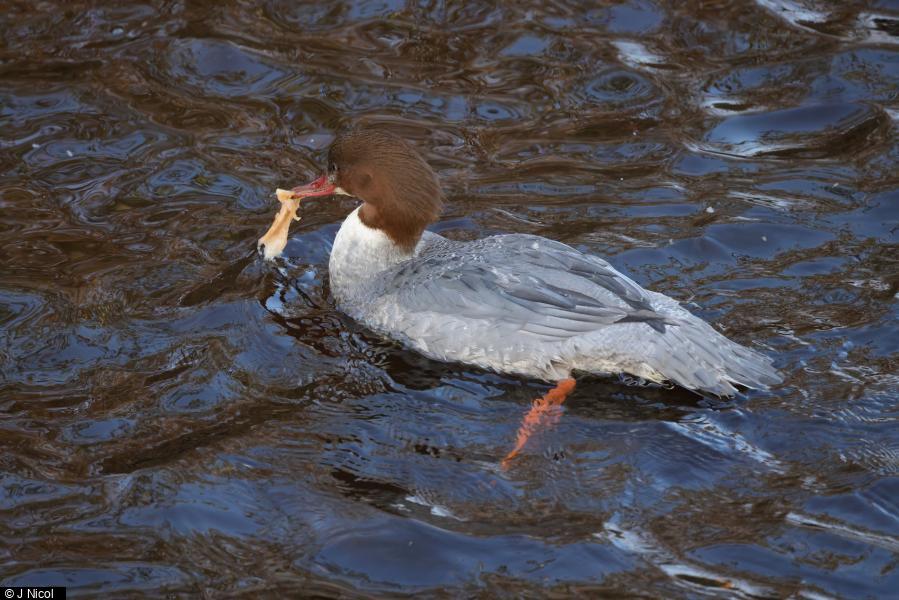 Goosander - 9 - 2 drakes with 7 redheads feeding on scraps of bread. ; Kingfisher - 1 ; Grey Heron - 1