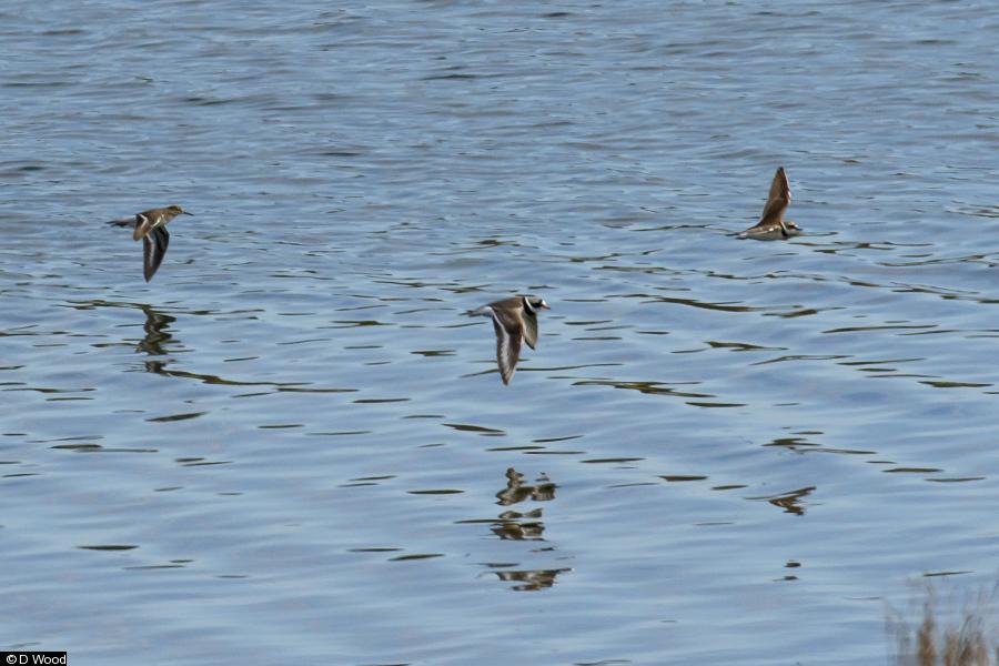 Common Sandpiper - 1 - at S end of big lake at 08.30. ; Common Sandpiper - 1 - main lake ; Little Ringed Plover - 1 - flushed by dog walker on shoreline (flight comparison with Ringed Plover and Common Sand) ; Sand Martin - 55 - gathered late morning in dribs and drabs before all leaving N ; Swallow - 1 ; Grey Partridge - 2 - W side of main lake
