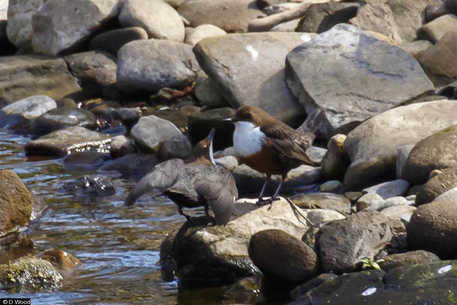 Grey Wagtail - 2 - pair in courtship ; Dipper - 2 - pair in courtship/ copulation ; Dipper - 2 - flew under bridge and upstream