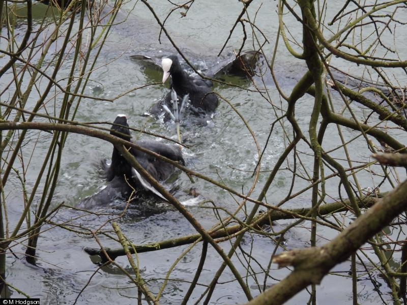 Mute Swan - 4 - 2 ad + 2 juv ; Chiffchaff - 2 - singing ; Song Thrush - 1 - singing ; Great Crested Grebe - 10 - 5 pairs ; Gadwall - 1 ; Coot - 10+ - 2 on nests, 2 males fighting with female observing