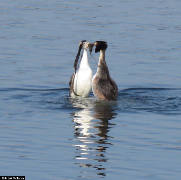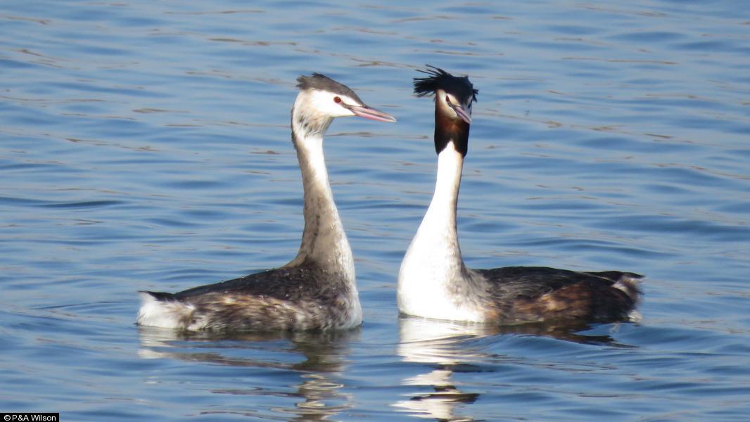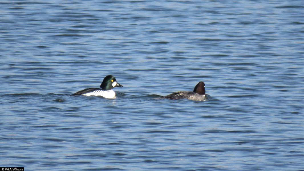 Black-headed Gull - 150+ ; Tufted Duck - 25+ ; Goldeneye - 4 ; Cormorant - 6 ; Skylark - 2+ - Singing ; Great Crested Grebe - 4 - 2 doing full mating display - synchronised head movement ; Great Crested Grebe - 4 - Bring gift ; Great Crested Grebe - 4 - The dance ; Great Crested Grebe - 4 - The dance pt2