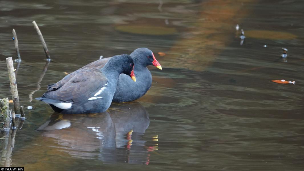 Cormorant - 2 - One had a phenomenally high success rate of dives to fish caught - poor photo but shows size of fish well ; Moorhen - 2+