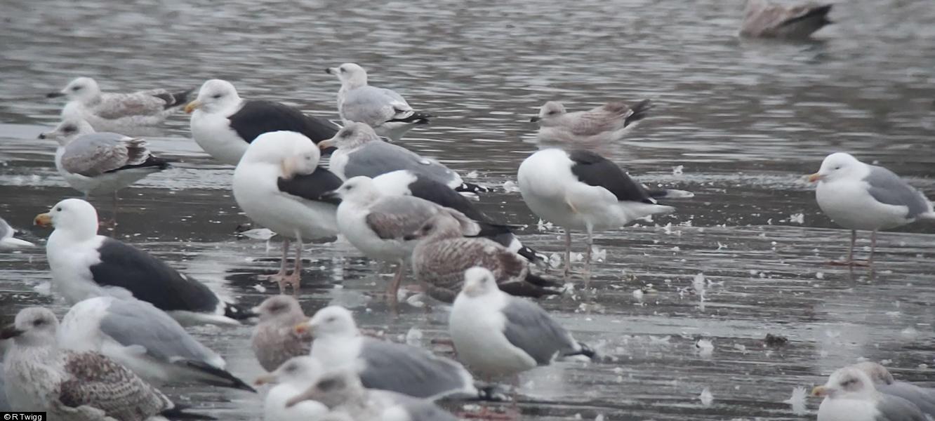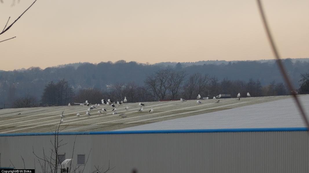 - 2 - first winter (back left of photo on water), and second winter left centre on ice. ; Great Black-backed Gull - 215 - Pre roost on ice until 17.00 ; Lesser Black-backed Gull - 8 ; Herring Gull - 388 ; Common Gull - 1 ; Black-headed Gull - C500 ;