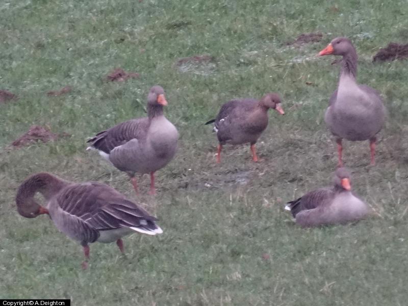 Greylag Goose - c300 - Feeding in fields just to E below Peck Hall, still present up to dark (17:15). ;