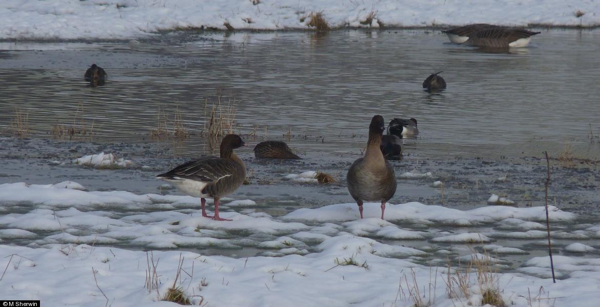 Greylag Goose - 68 - in fields by middle res ; 320 - 21 - on middle res ; Lapwing - 59 - on middle res ; Black-headed Gull - 47 - on middle res ; Herring Gull - 4 - on middle res ; Linnet - 11 - on middle res