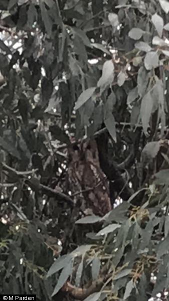 Tawny Owl - 1 - perched in eucalyptus tree till dusk