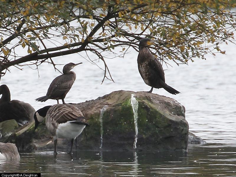 - 1 - juv sat on rock on N side of the main lake island with Cormorants 12:40 (photo left hand bird) ;