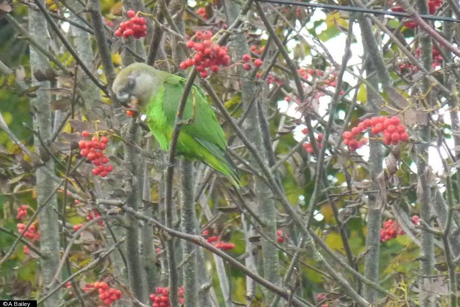 322 - 1 - Probably a Brown-headed Parrot. Seen most days for the last 12 days eating Rowan berries