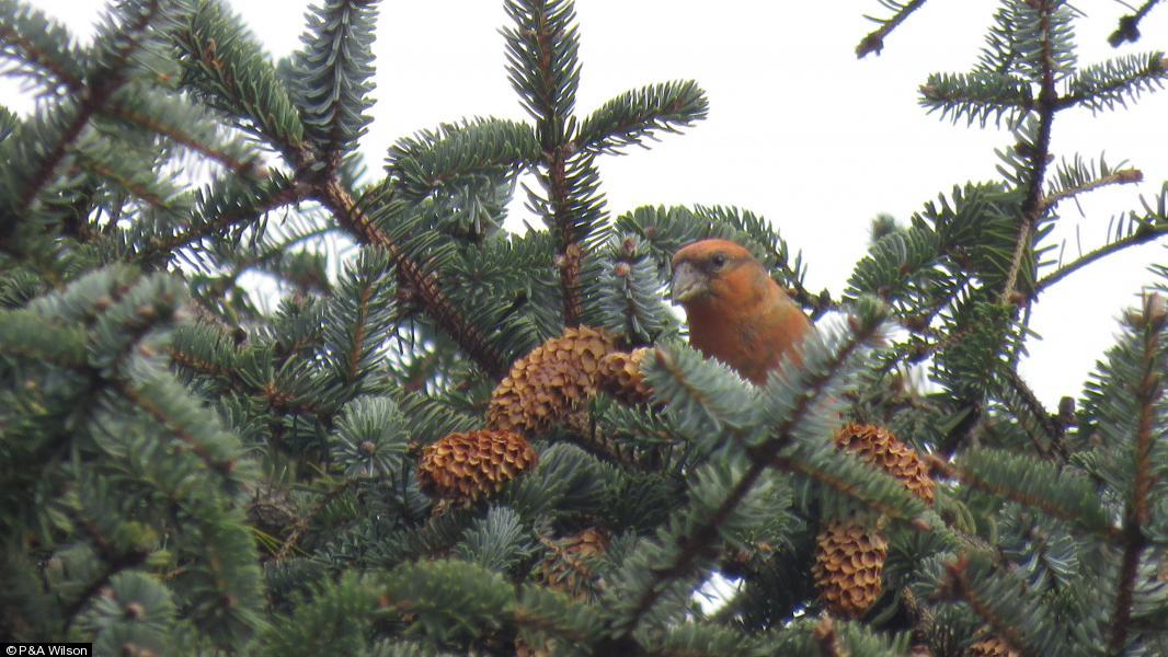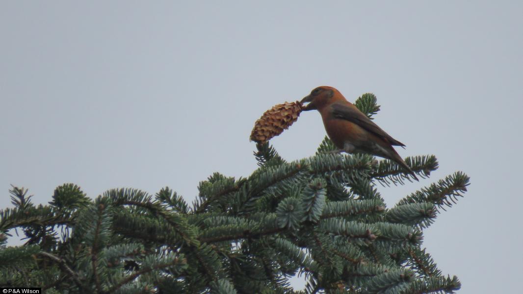 Crossbill - 12+ - M&F feeding in trees on main rd adj to conduit ; Crossbill - 12+ - Male ; Crossbill - 12+ - Another male ; Tufted Duck - 9 - M&F ; Long-tailed Tit - 4+ ; Black-headed Gull - 15