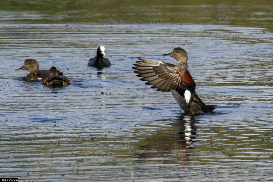 Gadwall - 39 - At N end. ; Tufted Duck - 13 - 12 at S end ; 320 - 1 - Fem at N end ; Mute Swan - 4+ - 2 pairs, each with 5 fully grown cygnets ; Jay - 1 - Flew across lake ; 324 - 1 - Southern Hawker at S end ; Sand Martin - 6 - Hawking insects at S end ; Gadwall - 39 - photo ; Gadwall - 39 - another photo