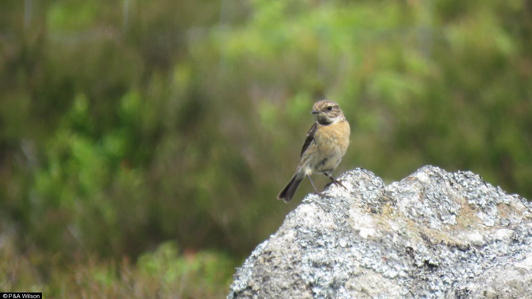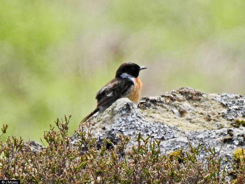 Meadow Pipit - 11 ; Stonechat - 7 - 2 Juv ; Willow Warbler - 1 ; Swift - 3 ; Whinchat - 1 - Male, singing ; Ring Ouzel - 3 - 2 on West side in plantation, 1 on East side on rocks calling ; Cuckoo - 1 - Heard, in plantation ; Reed Bunting - 2 - Male carrying nesting material ; Ring Ouzel - 2 - males calling ; Stonechat - 5 - 2 adult males and 3 juvs ; Stonechat - 5 - photo of second adult male ; Raven - 1 - Landed in plantation ; Whinchat - 2 - Female and juv ; Reed Bunting - 2 - singing males