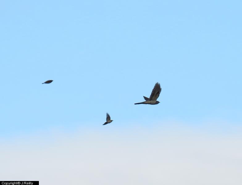 319 - 1 - High over constantly harassed by a crow. 11.55 ; Mistle Thrush - 1 ; Pied Wagtail - 1 ; Grey Wagtail - 1 - pond ; Moorhen - 2 ; Robin - 1 - singing ; Song Thrush - 1 - singing ; Chiffchaff - 2 - singing ; Reed Bunting - 2 - Pair feeding by river ; Whitethroat - 3 - 1 pair + 2 males singing and alarm calling. ; Lesser Whitethroat - 1 - singing ; Jackdaw - 4 - Feeding near top pond ; Carrion Crow - 1 - With Jackdaws.