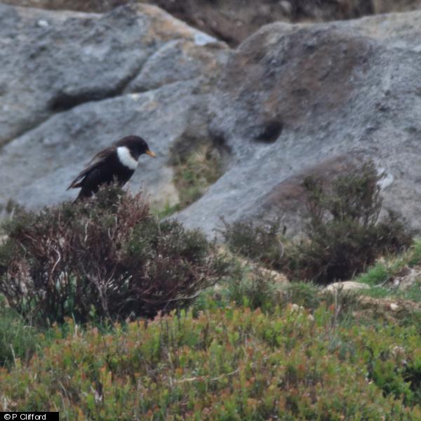 Ring Ouzel - 2 - males, one defending a settled territory, occasionally seeing off other persistent male ; Skylark - 1 - Alone, not singing or displaying, just moving along below edge in short periods of flight. On slope.