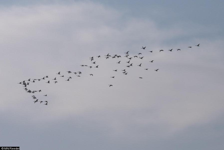- 87 - Flew north at 07:42. Two dropped onto Small Lake much to the annoyance if the resident Mutes, ; Little Ringed Plover - 2 ; Goosander - 4 ;