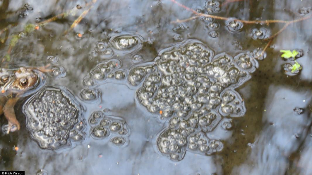 Dipper - 4 - 2 seen together, 1 had a silver ring on right leg ; Goosander - 2 - M&F ; Grey Heron - 1 ; 324 - 2 - Frogs mating, frog spawn present.