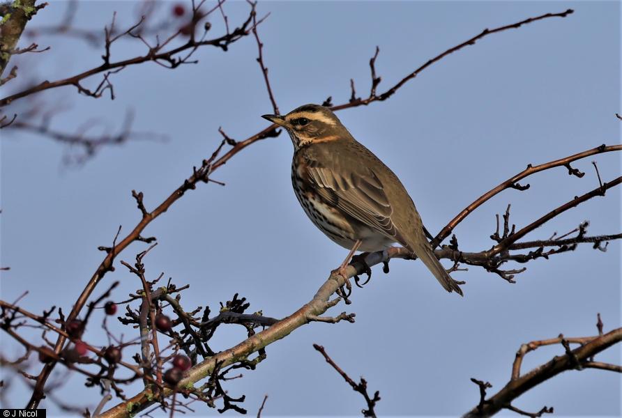 - c40 - feeding in Hawthorns ; Mistle Thrush - 1 - in thrush flock ; Chiffchaff - 1 - in small tit-flock, calling constantly ; Bullfinch - 1 - female ; Lapwing - 1 - SW ; Yellowhammer - 2 ; Meadow Pipit - 1 ; Stock Dove - 1 - over ; Sparrowhawk - 1 - hunting over scrubby hillside ; Goldfinch - 5 ; Jay - 1