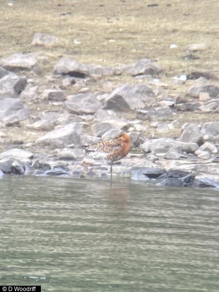 - 1 - Feeding on western shoreline, flighty at times and appeared to leave SW before returning and settling. ;